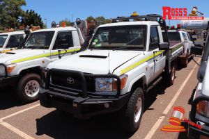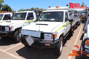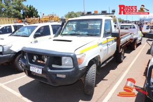 04/2012 TOYOTA LANDCRUISER 79 TRAYBACK, WHITE, 4X4, MANUAL, P/S, A/C, V8 DIESEL, REG#1EAO348 LIC: 23.2.19, ODO# 150,247 KMS SHOWING ON CLOCK, VIN# JTELV71J100026388, ENG# 1VD0159698, KEVREK CRANE, INTERNAL ROPS, TOOLBOX IN TRAY, ROOF MOUNT WORK LIGHTS, FL# LV5136, PRDA-KS, KEY# 177 (W7748)