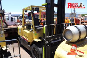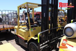 2004 HYSTER H5.00DX FORKLIFT, YELLOW, AUTO, GAS-V6, ODO# 15,628 HRS SHOWING, VIN# A232R02363B, 2 STAGE MAST, SIDE SHIFT, SELF ADJUSTING TYNES, 1400mm TYNES, 5500mm HEIGHT CAPACITY, 5000kg, 1500mm CRADLE, PLUS WEIGH SAFE SCALES, FL# 2874, KEY#21