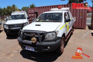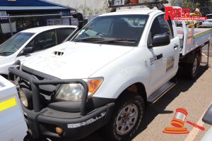 2010 TOYOTA HILUX TRAY BACK, DUAL CAB, WHITE, 4X4, AUTO, P/S, A/C, D4D, (REG#UNLIC) ODO# 141,805 KMS SHOWING ON CLOCK, VIN# MR0FZ22G301044947, ROO BAR, TOW BAR, ROOF MOUNT MINE SPEC LIGHTING, INTERNAL ROPS, TOOL BOX IN TRAY, FL# WB107, PRDA-KS, KEY# 25 (W7745)