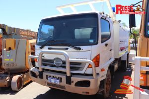2007 HINO 500 TRAY TOP, WHITE, AUTO, REG# KBC569F LIC: 31.7.19, ODO# 65,275 KMS SHOWING ON CLOCK (9944.5 HRS) VIN# JHDFM8JRKXXX10030, ENG# JOBETB13906, ALUMINIUM BULLBAR, ROPS - FITTED OUT AS SERVICE VEHICLE, COMES WITH HOSE REELS, DIESEL TANKS, WASTE TANK, SIDE LOCKERS, GREASE PUMP (HEADLIGHTS REMOVED, REAR BRAKE BOOSTERS REMOVED, NO MIRRORS, SOME INTERIOR PARTS REMOVED) (HIRE # 07526) KEY# 262 (W7632)