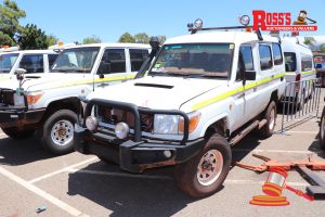 2011 TOYOTA LANDCRUISER UTILITY, WHITE, 4X4, MANUAL, P/S, A/C, V8 TURBO DIESEL, (REG#UNLIC) ODO# 274,066 KMS SHOWING ON CLOCK, VIN# JTELV71J800023035, ENG# 1VD0137187, BULLBAR, SNORKEL, SIDE STEPS, LIGHTBAR, BEACON, WORKLIGHTS, EXPLOSIVE BOX, FIRE EXTINGUISHER BRACKET, TOWBAR - NO HITCH, WATER TANK, FRONT SIGN HOLDERS, FL# 03D183, (FRONT RIGHT HAND GUARD DAMAGE NEAR DOOR) S44#44539, KEY# 174 (W7707)