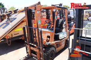 2002 TOYOTA FORKLIFT, MODEL# 4FG15, ORANGE, AUTO, GAS, SINGLE STAGE MAST, NO SIDE SHIFT, HEIGHT CAPACITY 3000mm, ODO# 4977 HRS SHOWING, VIN#FG18-42905, KEY#84