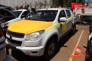 2013 HOLDEN COLORADO 4X4 DUAL CAB TRAY BACK, WHITE, 4X4, AUTO, P/S, A/C, TURBO DIESEL 2.8, (REG#UNLIC) ODO# 119,183 KMS SHOWING ON CLOCK, VIN# MNU147DH0DH679949, ROOFMOUNT TAIL LIGHTS, TOWBAR, LOCKUP TOOLBOX IN TRAY, FL# LV4504, FX07283175, KEY# 173 (W7716)