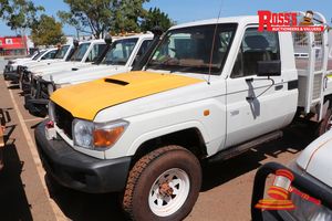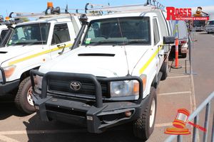 2012 TOYOTA LANDCRUISER TRAYBACK, WHITE, 4X4, MANUAL, P/S, A/C, DIESEL V8 (REG#UNLIC) ODO# 133,811 KMS SHOWING ON CLOCK, VIN# JTELV71J600029111, TOWBAR, INTERNAL ROPS, DUAL SPARE WHEEL CARRIER BEHIND CAB, FL# LV5144, (ENGINE KNOCK, BENT TAIL SHAFT, DASH IN PIECES) PRDA#201812665731 KEY# 161 (W7760)