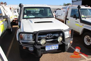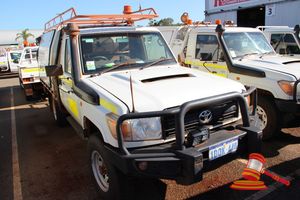 2009 TOYOTA LANDCRUISER TRAY TOP WHITE 4X4 MANUAL, P/S, A/C, V8 TURBO DIESEL, BULLBAR, WORKLIGHTS, BEACON, FULL ENCLOSED, TOOLBOXES X 2, DUAL TYRE CARRIER BUILT INTO TRAY, TOWBAR (NO HITCH) REG NO - 1ECW881 LIC: 23.5.19, ODO - 227,705KMS SHOWING, VIN NO - JTELV71J500013904, ENG# 1VD0074863,(A/NO-VL8117) (KEY#G) (W7841)