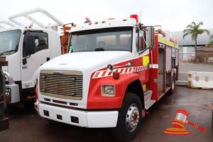 09/1997 FREIGHTLINER FL80 FIRE TRUCK, RED, 4X2, AUTO, P/S, A/C, DIESEL, (REG#UNLIC) ODO# 32,945 KMS SHOWING ON CLOCK, VIN# 1FV6JLCB9WH937739, DARLEY PUMPS MODEL# EMH-1500, WATER CANON, INLET 150mm TO 64mm/OUTLETS 64mm, FL# RESCUE, KEY#146 (W8065)