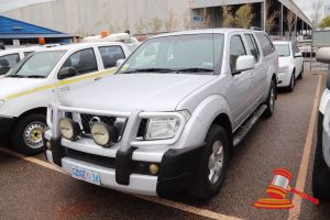 2010 NISSAN NAVARA DUAL CAB, SILVER, 4X4, AUTO, P/S, A/C, DIESEL, REG#GIDGE34 LIC: 13.07.19, ODO# 260,506 KMS SHOWING ON CLOCK, VIN# MNTVCUD40A0012211, ENG# YD25249601T, TOWBAR (NO HITCH) WELL BODY WITH SUV - PLUS CANOPY, SPOTLIGHTS, FACTORY FITTED ALUMINIUM BULLBAR, KEY#4 (W8147)