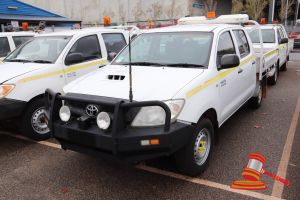 02/2012 TOYOTA HILUX 150 SERIES DUAL CAB, TRAY TOP, WHITE, 4X2, MANUAL, P/S, A/C, DIESEL, (REG#UNLIC) ODO# 84,849 KMS SHOWING ON CLOCK, VIN# MR0EZ12G004155279, ROOBAR, INTERNAL ROPS, ROOFMOUNT MINE SPEC LIGHTING, FL# AP010, KEY#176 (W8167)