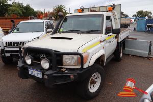 2009 TOYOTA LANDCRUISER VDJ79 TRAY TOP, WHITE, 4X4, MANUAL, P/S, A/C, V8 TURBO DIESEL, REG#1DEG015 LIC: 31.7.19, ODO# 262,689 KMS SHOWING ON CLOCK, VIN# JTELV71J400012825, ENG# 1VD0070886, BULLBAR, SPOTLIGHTS, WORKLIGHTS, BEACON, TOWBAR, SPARE TYRE, FL# LV8526, KEY#40 (W8172)