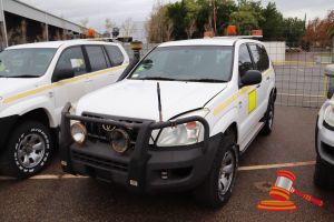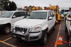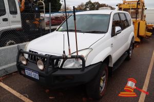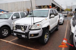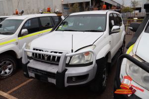 01/2008 TOYOTA PRADO WAGON, WHITE, 4X4, AUTO, P/S, A/C, D4D, (REG#UNLIC) ODO# 149,582 KMS SHOWING ON CLOCK, VIN# JTEBZ29J500165656, BULLBAR, TOWBALL, BEACON, SPOTLIGHTS, TYRE RACK, ROLLBAR, CARGO BARRIER, FL# NJV30, MEP20180804-3, KEY#411 (W7912)