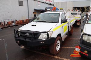 11/2008 TOYOTA HILUX SR SINGLE CAB TRAY BACK, WHITE, 4X4, AUTO, P/S, A/C, D4D, (REG#UNLIC) ODO# 111,227 KMS SHOWING ON CLOCK, VIN# MR0DZ22G500013504, ROOBAR, SNORKEL, TOWBAR, ROOF MOUNTED MINE SPEC LIGHTING, FL# PL28, KEY#33 (W8106)