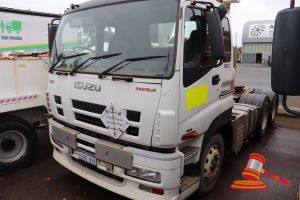 04/2012 ISUZU GIGA SITEC 455 PRIMEMOVER, WHITE, 6X4, AUTO, P/S, A/C, DIESEL, (REG#UNLIC) ODO# 131,485 KMS SHOWING ON CLOCK, VIN# JALCXY52MB7000010, JOST SKID PLATE, 10 STUD STEEL RIMS, EXTERNAL ROPS, FLEXI-REAR GUARDS, FL# BEC332, (MP77#5824, OMR#00081) KEY#97 (W8136)