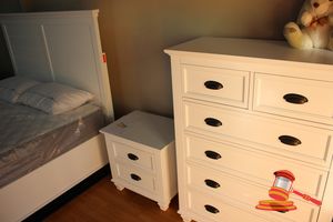 WOOLSTORE BEDROOM SUITE, QUEEN BED, 2 BED SIDES, 1 TALL BOY