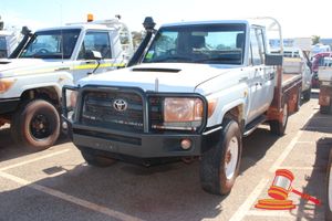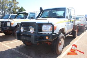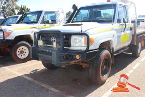 6/2006 TOYOTA LANDCRUISER 1HZJ79R TRAY BACK WHITE 4X4 MANUAL, P/S, A/C, 6 CYLINDER DIESEL, BULLBAR, SNORKEL SIDE STEPS, DUAL BATTERIES, ISOLATOR, WARNING LIGHT, ROPS, SPARE WHEEL CARRIER, 2 X COFFIN SINLGE TOOLBOX, TOWBAR, REG NO - KBC454H (LIC 31/1/20) ONE PLATE ONLY, ODO - 287,013KMS SHOWING, ENG NO - 1HZ0525857, VIN NO - JTELB71J507059118, KEY#25 (DR#5242) (W#8457)