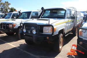 2008 TOYOTA LANDCRUISER SINGLE CAB TRAY TOP, WHITE, 4x4, MANUAL, P/S, A/C, V8 TURBO DIESEL (REG#UNLIC) ODO# 251,578 KMS SHOWING ON CLOCK, VIN# JTELV71J500008346, ENG# 1VD0039287, BULLBAR, REAR WORKLIGHT, TOWBAR WITH PARROT HITCH, FL# 03R156, S44#RITM3397006, KEY#192 (W8454)