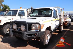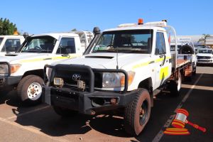 2010 TOYOTA LANDCRUISER SINGLE CAB TRAY TOP, WHITE, 4x4, MANUAL, P/S, A/C, V8 TURBO DIESEL, (REG#UNLIC) ODO# 250,000 KMS APPROX, VIN# JTELV71J300017627, ENG# 1VD0097545, BULLBAR, SPOTLIGHTS, TRAY MOUNTED FUEL TANK WITH HOSE & NOZZLE, TRAY MOUNTED TOOLBOX, TOWBAR (NO HITCH) FL# 03H3595, S44#RITM3412370, KEY# 199 (W8456A)