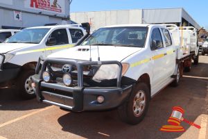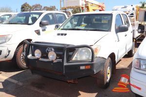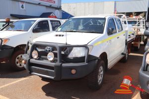 2011 TOYOTA HILUX DUAL CAB, WHITE, 4x4, MANUAL, P/S, A/C, D4D (REG#UNLIC) ODO# 250,958 kms SHOWING ON CLOCK, VIN#MR0FZ22G601175273, ENG# 1KD5309336, BULLBAR, SPOTLIGHTS, TRAY MOUNTED TOOLBOX, LIGHTBAR IN REAR, 2 x SPARE TYRES, TOWBAR (NO HITCH) (1 x SPARE TYRE POOR CONDITION) KEY#24 (W8491)