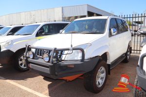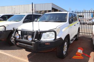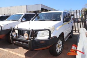 2006 TOYOTA PRADO GXL WAGON, WHITE, 4x4, MANUAL, P/S, A/C, D4D, BULLBAR, SPOTLIGHTS, INTERNAL CARGO BARRIER, SPARE TYRE, REG#UNLIC, ODO# 182,073 KMS SHOWING ON CLOCK, VIN# JTEBY29J100044254, ENG# 1KZ1429303, FL# 03H1949, S44#RITM3468676, KEY#77 (W8504)