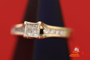 A STAMPED 18CT YELLOW GOLD, DIAMOND RING WITH 4 CENTRAL PRINCESS CUT DIAMONDS OF 1.8MM DIAM. & 8 SHOULDER ROUND BRILLIANT CUT DIAMONDS OF BETWEEN 0.03CT - 0.015CT EACH APPROX., CHANNEL SET, 4 EACH SHOULDER & WEIGHS 3.0GRAMS. VALUE $430 (KFB/11)