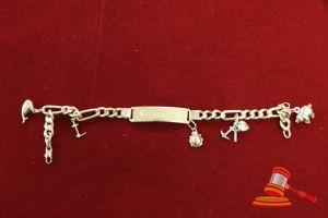 A STAMPED 18CT YELLOW GOLD, ID CHAIN BRACELET WITH 5 ASSORTED 9CT GOLD CHARMS & WEIGHS 18.1GRAMS. VALUE $1000 (KFB/17)