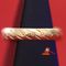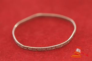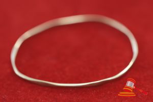A TESTED YELLOW GOLD, PART BEATEN PATTERNED BANGLE. MISSHAPEN. ITEM WEIGHS 5.4GRAMS. VALUE $150 (KFB/25)