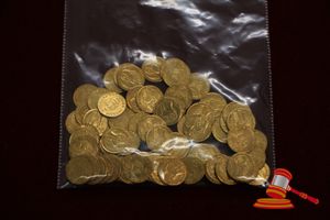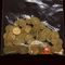 APPROX 147 = 69.8 GRAMS, GOLD COLOURED METAL COINS/DISCS & 2 = 0.20 GRAMS NUGGETS - TESTED GOLD & 1 = 0.62 GRAMS PRESENTATION PACKAGE - 1 GRAIN VALUE $70 (ITEM#0034)