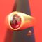 A STAMPED 18CT YELLOW GOLD, 1 SYNTHETIC RUBY SET SIGNET RING WITH 1 SYNTHETIC Ruby, OVAL CABOCHON, RUB OVER SET IN THE TOP/HEAD OF THE CONTINUOUS BAND. ITEM WEIGHS 9.5GRAMS. VALUE $500 (KFB/01)