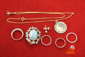 BAG CONTAINING 4 x RINGS; 1 x BROOCH; 1 x PENDANT; 1 x PR EARRINGS & 1 x PENDANT ON CHAIN