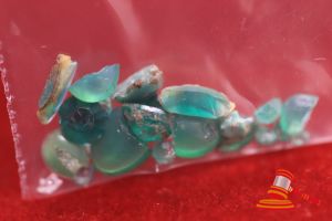 2 x BAGS OF ASSORTED GREEN STONES INCLUDING PERIDOT, EMERALD, JADE APPROX 60 = 5.10CT & APPROX 57 = 21.29 INCLUDING SOME SYNTHETICS; BROKEN STONES APPROX = 2.73CT; 1 x 1.13mm SINGLE CUT DIAMOND VALUE $1320 (ITEM#0017H)