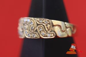 A STAMPED 9CT YELLOW GOLD, DIAMOND SET BAND RING WITH 18 SINGLE CUT DIAMONDS OF 0.005CT EACH APPROX. SET IN THE S/TWIST DESIGN TOP/HEAD. ITEM WEIGHS 3.3GRAMS. VALUE $150 (KFB/05)