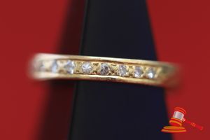 A STAMPED 18CT YELLOW GOLD, DIAMOND SET BAND RING WITH 11 SINGLE CUT DIAMONDS OF 0.015CT EACH APPROX. PAVE SET IN TOP/HEAD OF FLAT & CONTINUOUS BAND & WEIGHS 1.8GRAMS. VALUE $310 (KFB/10)