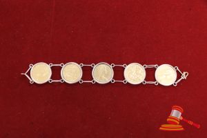 A YELLOW GOLD, COIN SET BRACELET WITH 5 COINS, ALL STAMPED 1983, TWO HUNDRED DOLLARS, YOUNG QUEENS HEAD ON ONE SIDE & KOALA ON OTHER SIDE. EACH COIN IS DESCRIBED AS 10GRAMS EACH, 22CT GOLD EACH & ARE HELD IN YELLOW GOLD BEZEL FRAMES ATTACHED BY LONG OPEN LINKS. ITEM WEIGHS 69.4GRAMS. VALUE $4200 (KFB/23)