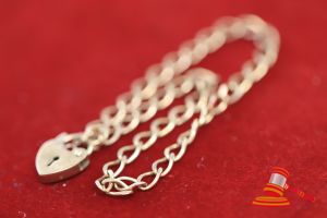 A STAMPED 9CT YELLOW GOLD, HEART SHAPED PADLOCK HELD CHAIN BRACELET OF CURB LINK, 19CMS LONG. ITEM WEIGHS 3.3GRAMS. VALUE $90 (KFB/28)