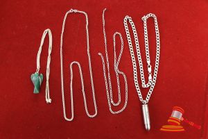 BAG CONTAINING 1 x NECKLACE WITH GREEN STONE PENDANT; 1 x NECKLACE WITH "BULLET" PENDANT; 2 x NECKLACES