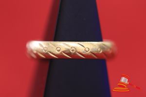 A STAMPED 22CT YELLOW GOLD, BAND RING, PATTERNED & SLIGHTLY ROUNDED & WEIGHS 3.7GRAMS. VALUE $250 (KFB/19)