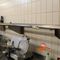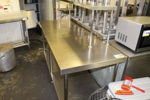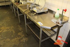 WALL MOUNTED STAINLESS STEEL BENCH WITH DRAWER & SINK AREA. APPROX 5500mm LONG WITH BEND