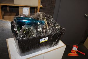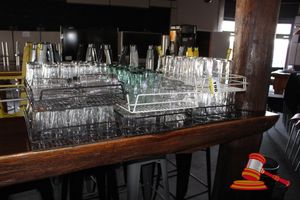 BLACK TUB CONTAINING GLASS WATER BOTTLES