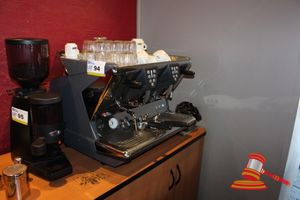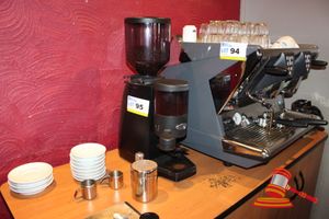 LA SAN MARCO 100E SPRINT, 2 GROUP COFFEE MACHINE WITH 2 HANDLES AND ASSORTED KIT INCLUDING MUGS, LATTE GLASSES, SAUCERS, SUGAR SATCHELS ETC