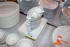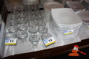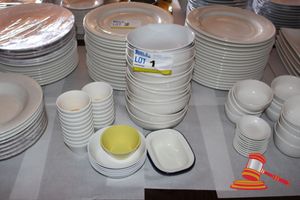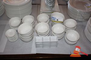 ASSORTMENT OF WHITE CERAMIC BOWLS AND SAUCE TRAYS
