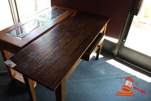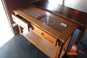 TIMBER HALL TABLE WITH GLASS INSERTS, 2 DRAWERS, 1227mm L x 450mm W x 750mm H