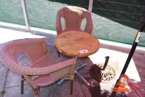 OUTDOOR SEATING SET INCLUDING 2 x PLASTIC CANE CHAIRS WITH ROUND TABLE APPROX 600mm DIAMETER