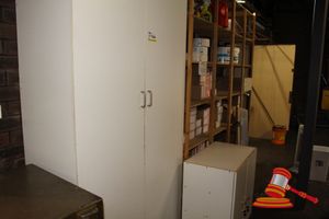 DOUBLE DOOR WHITE CLEANERS CABINET WITH CONTENTS, 2420mm x 1200mm x 470mm & 2 DOOR CABINET 750mm x 790MM X 470MM