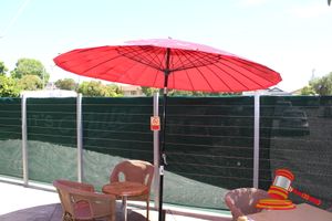PINK ROUND CAFE UMBRELLA APPROX 2.4m DIAMETER WITH STAND