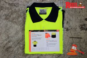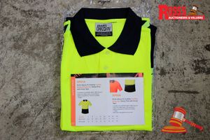 10 x SHORT SLEEVE HI-VISABILITY COOLDRY POLYESTER SAFETY POLO WITH WARNING TAPE. LIME/BLUE. SIZE LARGE (1 x OPENED)