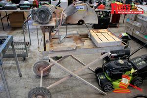 BRICKSAW ON STAND/WHEELS - CMG SINGLE PHASE INDUCTION MOTOR, 1.5kw, 240v NO BLADE, USED CONDITION, REAR MOTOR COVERED IN SELASTIC