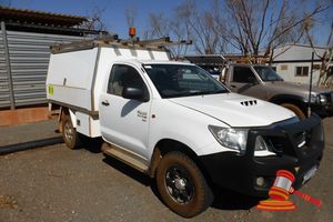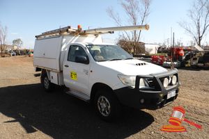 02/2013 TOYOTA HILUX SR 150 SER 4X4 MANUAL 3.0 D4D TURBO DIESEL SINGLE CAB TRAY TOP WITH SERVICE BODY. REGISTRATION 1EEU 232 (EXPIRES 20.5.20) APPROX 136,300 KM SHOWING, VIN -MRODZ22G300024310. SMART BAR, TWO WAY, A/C, SIDE AND REAR STEPS, ISOLATOR, SEAT COVERS, ALUMINIUM TRAY WITH XL SERVICE CANOPY WITH 2X FOLD OUT SIDE DOORS AND INTERNAL STORAGE (CONTENTS NOT INCLUDED), 2X LADDER RACKS, TOW ASSEMBLY, 2X UNDER TRAY TOOL BOXES, LAST SERVICE -134,649 KM SERVICED BY PILBARA TOYOTA)-SERVICE HISTORY AVAILABLE. INSPECTION NOTES: STARTS AND RUNS, NORMAL WEAR FOR AGE. TEST DRIVE AVAILABLE DURING ALLOCATED INSPECTION PERIODS (DR#)