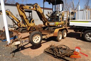 CATERPILLAR 301.8C 1.8 TONNE EXCAVATOR (1667 HOURS SHOWING).VIN -CAT3018CVJSB04695. S/N 0191453. REGISTRATION 1DCQ 280 (EXPIRES 22/06/2020). INC GRADER BLADE, ISOLATOR, SOLID ROOF CANOPY, POWER HEAD & 200MM AUGER, BUCKETS 230, 300, 600MM, CRANE HYDRAULIC ANTI DROP VALVES, RATED LIFTING POINT, LAST SERVICE -1494 HOURS (SERVICED BY WESTRAC)-SERVICE HISTORY AVAILABLE. INSPECTION NOTES: STARTS AND RUNS. NORMAL WEAR FOR AGE. DEMONSTRATION AVAILABLE DURING ALLOCATED INSPECTION PERIODS. TO BE SOLD WITH 2009 AUSWIDE 14 X 6M TANDEM AXLE ALUMINIUM TRAILER WITH RAMPS AND SPARE TYRE, REGISTRATION -1TKC 538 (EXPIRES 23/06/2020) VIN -6T9T26V97904BZ074. (DR#)