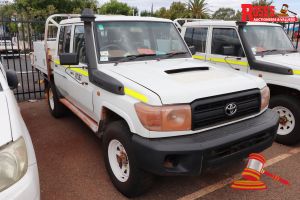 2014 TOYOTA LANDCRUISER DUAL CAB, WHITE, 4x4, MANUAL, P/S, A/C, V8 TURBO DIESEL (REG#UNLIC) ODO# 383,932 KMS SHOWING ON CLOCK, VIN# JTEBV71J904006779, ENG# 1VD0260285, TRAY MOUNTED TOOLBOX, LIGHTBAR IN REAR, TOWBAR, FL#03H7407, S44#RITM3485063, DR#64596, KEY#196 (W8964)