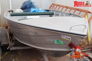 1995 STESSL 3.7m DINGHY, ALUMINIUM (UNLIC) S/N:370176-95, TOHATSU M18D 18hp OUTBOARD MOTOR, S/N:87044, REMOVEABLE CENTRE BENCH SEAT, 2 REMOVEABLE FOLDING CHAIRS, OUTBOARD TANK, OVER SIZE JOCKEY WHEEL FOR BEACH LAUNCH, REEF ANCHOR, SAND ANCHOR, LIGHT BOARD (NOT WORKING) 2 x BENCH SEAT CUSHIONS, LIFE JACKETS (OUTBOARD SERVICED 2 YRS AGO & NOT BEEN RUN SINCE, SUGGEST SERVICE PRIOR TO RUNNING TO AVOID PROBLEMS) TO BE SOLD WITH TRAILER 107563/2