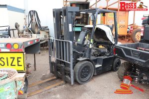 CROWN CG 25E-3 FORK TRUCK, GREY, GAS, 4x2, AUTO, P/S, CONTAINER MAST, ODO# 6358 HRS, FL1504, NO KEY